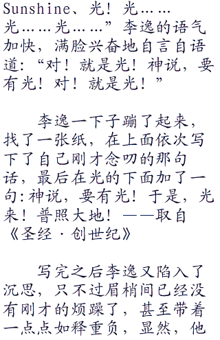 “恶魔、天使、阳光……”李逸反反复复念叨这三个词,中英文交叉着念,大脑在疯狂运转,想象着一切的可能。