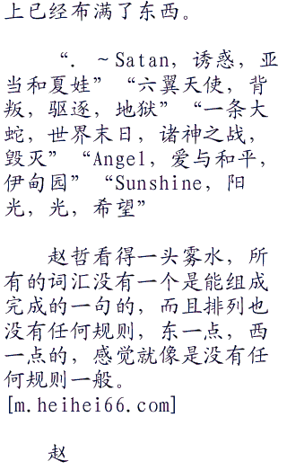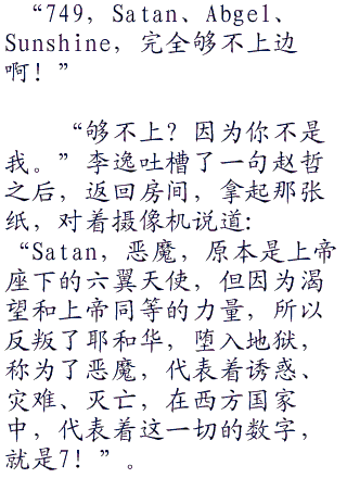 霓妮和baby那边陷入苦恼之中的时候,李逸终于找到了他的线索,上面有三个英文单词:satan、angel、sunshine。