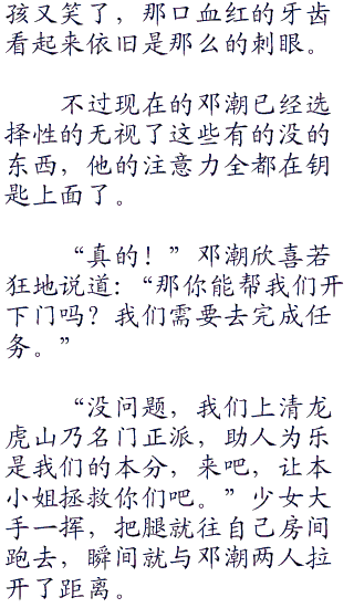 血红的牙齿在惨白脸色的衬托下显得异常刺眼,除此之外,她的双目居然也是红的,血红血红!异常深邃,盯着她那双眼睛仿佛随时都会深陷进去,堕入无边轮回,无法自拔一般。