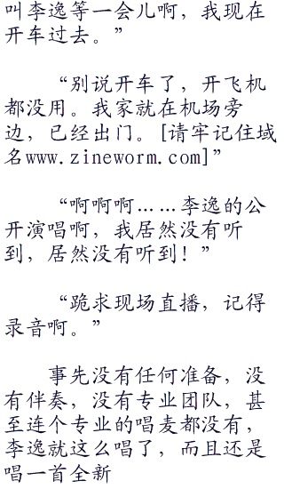 这时,李逸又说道:“这样,我给你们两个选择,第一个,继续把我围在这里,听我吹牛。第二个选择就是放我去播音室,我给你们唱一首我新的歌曲,怎么样?”