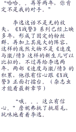 “李逸,《速度与激/情》的上映时间应该是明年年底,《x战警:第一战》也在那个时候上映了,我们到时候可得打对台了。”
