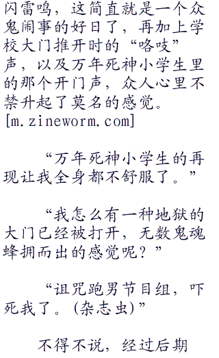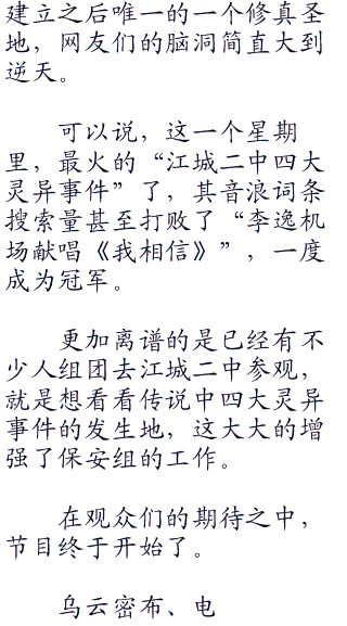 万圣节特辑上期最后留下的那个悬念实在太大了,四大灵异事件的故事掉足了所有人的胃口,特别是经过这几天的发酵,江城二中的学生们在网上讲述各种关于四大灵异事件的故事,从开始的单纯鬼故事到后面越说越玄乎,江城二中之前成了新中华