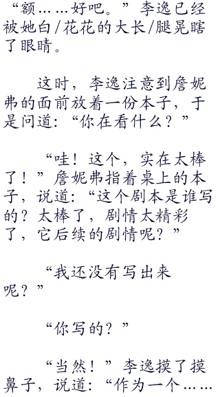 开门,购物袋已经好好的放在哪里,客厅里没有她的人,于是李逸尝试性地叫了一声:“詹妮弗~”