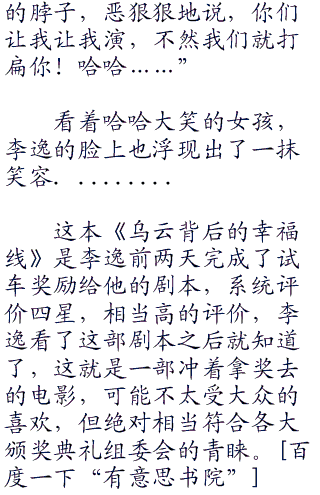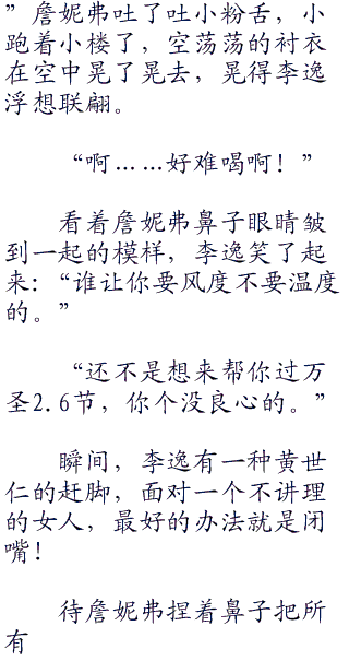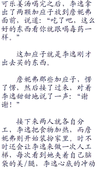 这时,她的手机响了,李逸的短信:洗漱用品在我衣柜的第三个格子里,有全新的,洗好澡赶紧把可乐姜汤喝了,我要买东西的地方比较远,可能晚一点回来。