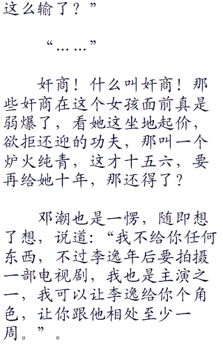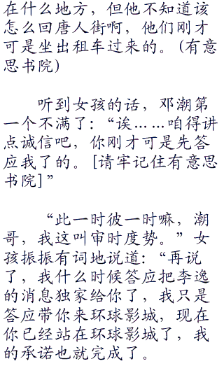 没错,李宸就是场外求助去了,谁没两个特别重要的人记住了他们的电话,这两个人里指不定就有办法联系到环球的人。像邓潮完全就可以打给娘娘,让娘娘再打电话给华宜,华宜那对兄弟可能和好莱坞这边有点关系撒,这样一切不就好解决了嘛。