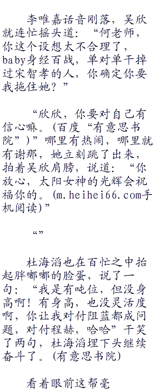 “谁说的?”何炯一下子站了起来,说道:“嘉嘉,郑凯就交给你了,分分钟收拾他;海滔,你的目标是程赫,吨位之战,最强胖子的决赛,在此一举了;欣欣,到时候你拖住baby就好了,然后让那那干掉阻蓝;至于邓潮就交给我了,我很有信心干掉他。”
