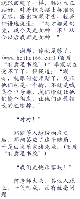 “就赌韩口号。”何老师说道:“我们喊快乐家族的集合口号,你们喊跑男的集合口号,我们看谁喊得更整齐,输的人接受名牌变大的惩罚,怎么样?”