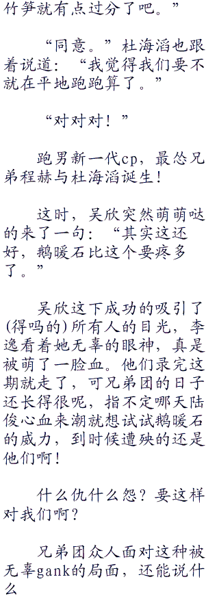 “我也善意的体型你们其他人,邓潮是跑男史上最多次背叛的人,李逸更是狡如狐,相信你们已经深有体会了。”