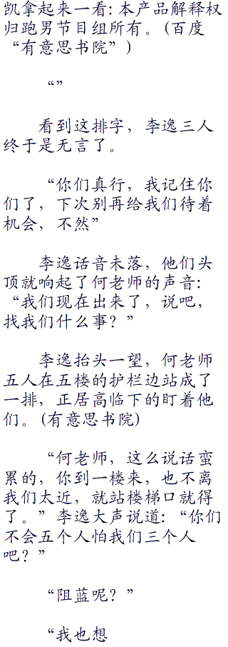郑凯话音刚落,阿军就掏出了一张黄牌,递给郑凯,说道:“由于选手指桑骂槐,讽刺伟大而英明的节目组,特此黄牌警告 。”