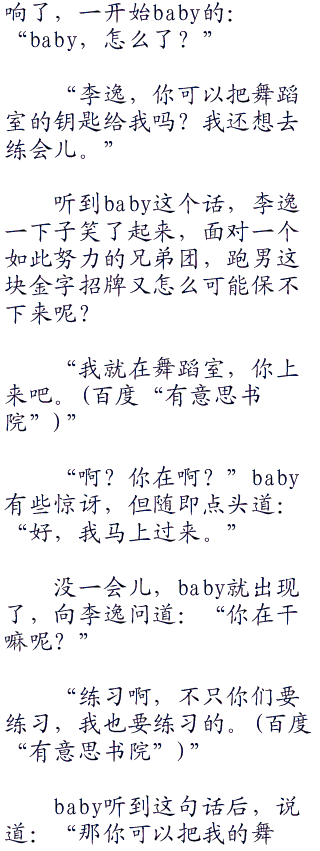 上午李逸还是每个人仔细教学,但下午的时候他就把所有时间花在baby身上了,因为其他人已经基本上可以顺利的又唱又跳了,只有baby,单独唱没问题,单独跳也没问题了,但又唱又跳,就问题不断。
