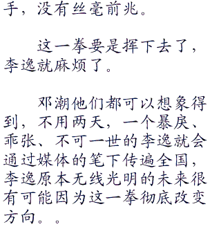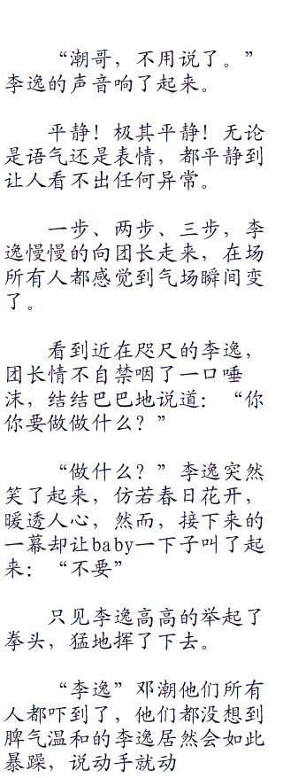 李逸此刻脸色铁青,上面写满了“我很不高兴”五个大字,在场所有人都看得出来,李逸的火气已经积聚到一个顶点了,就差那么最后一丝导火线就要爆发了。