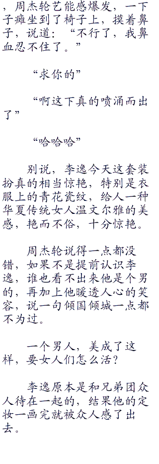 这一幕就发生在演唱会的后台,其实邓潮的女装是美的,他站在那里不动,长发披肩,还真有点味道,但这货此刻正趴在孙丽身上,一口一个“老公”叫着,不只是孙丽一身鸡皮疙瘩,兄弟团其他人也是浑身打颤。