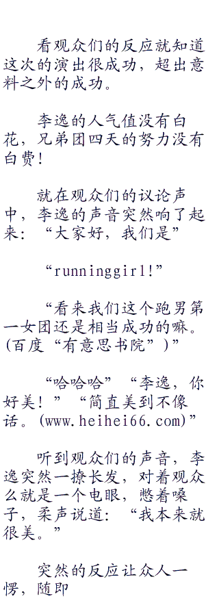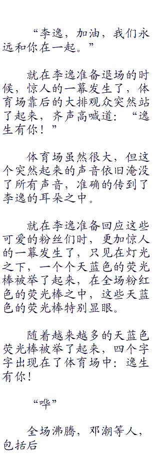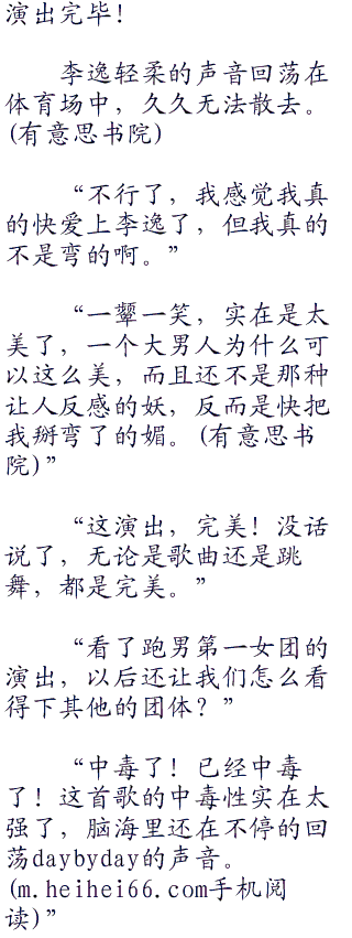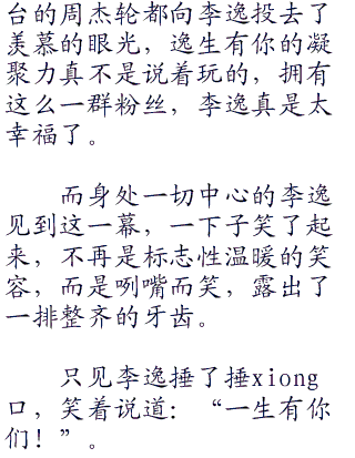 灯光从头顶直射而来,身边整齐划一的欢呼声和掌声,此时此刻的李逸终于懂得了周杰轮的那句话,他上台之前是非常紧张的,但此时此刻的他只有兴奋、激动,他觉得他就是这个世界的中心,这一刻,他下定了决心:这个舞台,也有我一份!