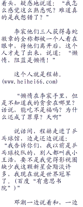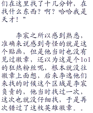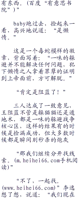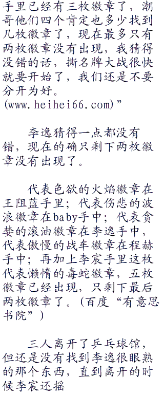 当然!李宸也只是开开玩笑,这个大家都知道是**了,不过翻遍了乒乓球馆也没找到徽章,想来是李宸看错了,于是三人决定去别的地方找找。