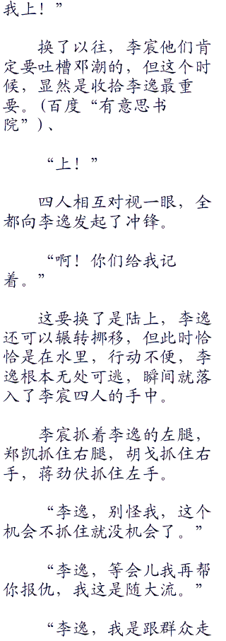 李逸正得意的时候,只见这四个人全都绕过了漂浮板,然后其其向李逸冲了过来。