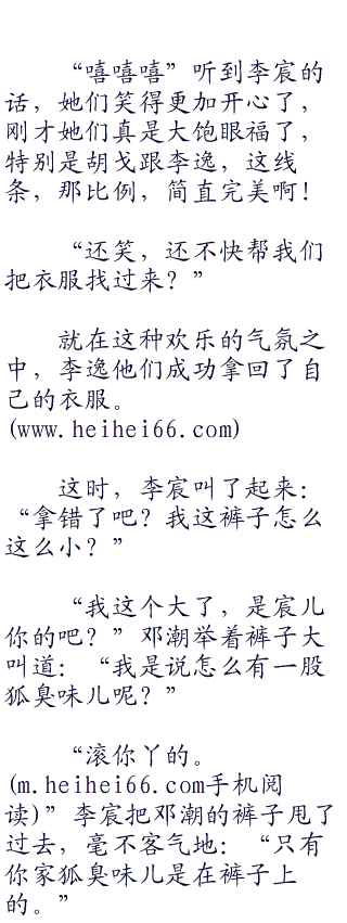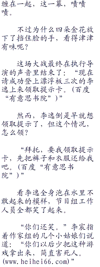 水花四溅,看着五个赤luo的大汉朝自己扑过来,王阻蓝和程赫这下是真的傻眼了,当他们反应过来想逃跑的时候,已经没有机会了,他们这小胳膊胖腿的,怎么可能逃脱得了李宸他们的魔爪。