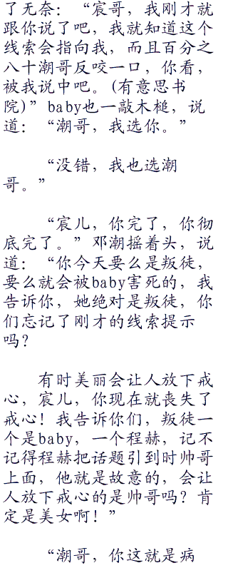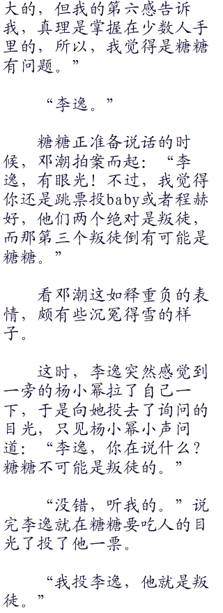 李宸和baby的行为实在太引人怀疑了,按照糖糖说的,他们手里肯定掌握了重要线索,无论是叛徒的还是特使的,都异常引人怀疑。