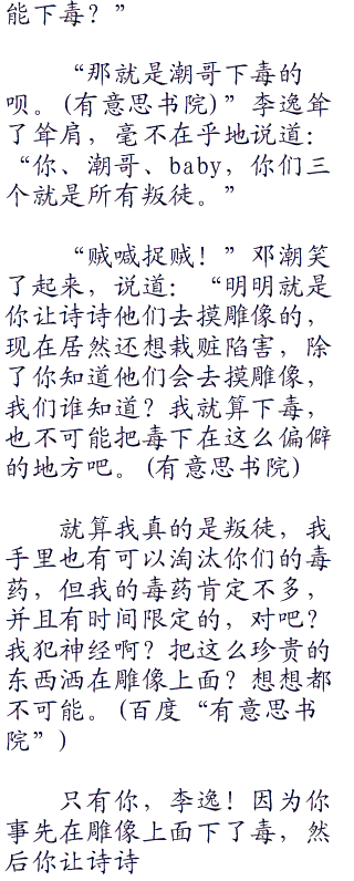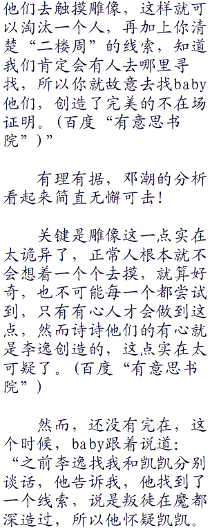 “baby,我就知道你会反咬一口。”李逸嘴角露出了自信地笑容,说道:“我刚才问了凯哥,在我接触他之前,他喝了你递过去的一瓶水,诗诗的淘汰也是这个道理,那个雕像上面肯定被赫哥还是潮哥下了毒,第一个触碰到的人就是死亡。”