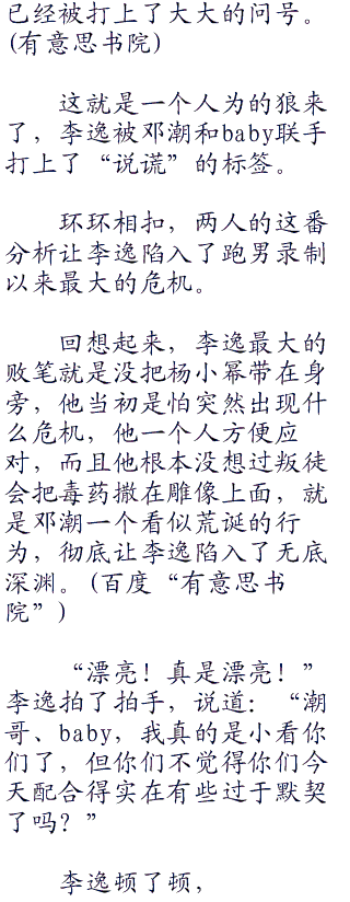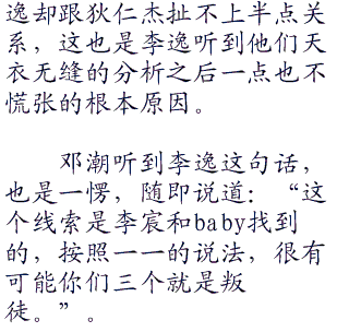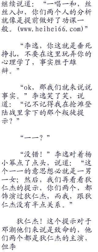 李逸和胡戈他们刚刚回到了大厅,baby就指着李逸对其他人说道:“就是李逸,凯凯刚刚跟李逸接触,就被淘汰了,李逸肯定就是叛徒。”