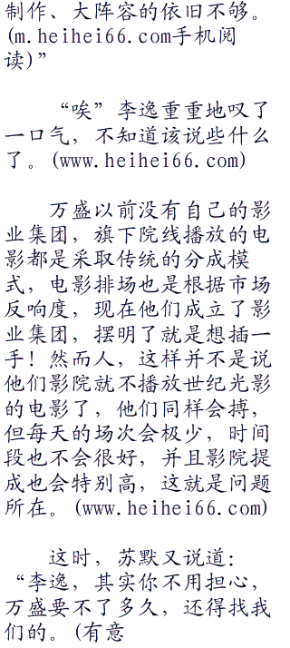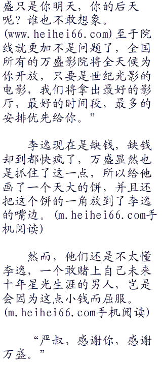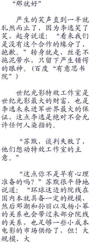 这完全就是把李逸当孩子哄的节奏,一亿五千万百分之三十,还分三年,你逗我呢?李逸都可以预见接下来的结果了,三年的时间足够他们把世纪光影摸个底朝天。