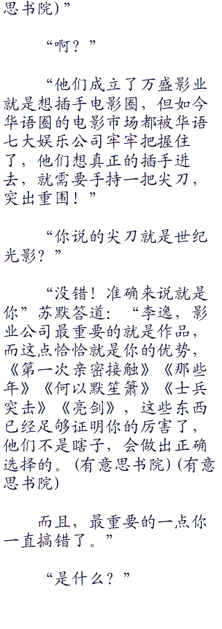 “小李,明人不说暗话。”严生顿了顿,说道:“我今天来的目的就是世纪光影,当然!我从苏总那里也大概知道了你的态度,所以我这里有一个最佳的方案。
