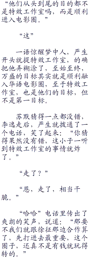 万盛影业给世纪光影特效工作室注资一亿五千万,三年,分三次注资,我们也不要世纪光影的股份,我们只要特效工作室百分之三十的股份,这样你依旧可以保证特效工作室的绝对控股权。”