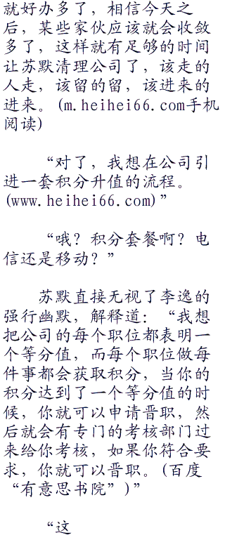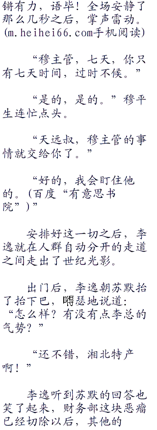 “行了。”李逸阻止了老杨继续说下去,看着在场所有人,笑了笑,说道:“我希望穆主管的事情是我手下的世纪光影第一例,也是最后一例!我不管你们以前做了什么,我既往不咎,但从今以后,千万别动不该动的脑经,别伸不该伸的手,否则,就不会是今天这么简单了。” 此话一出,始皇气势大作,在场所有员工都感觉到一股杀气扑面而来。