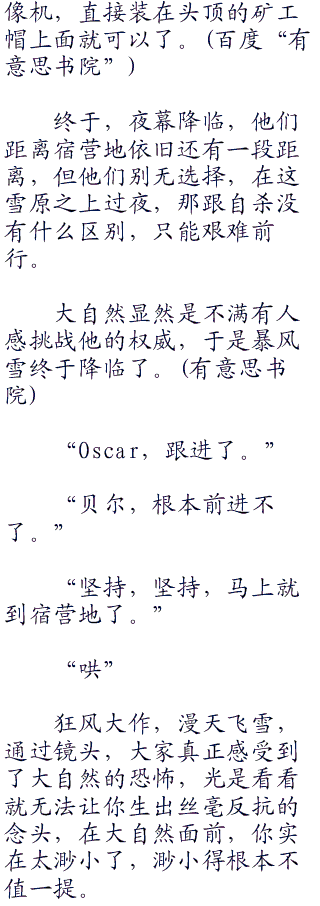 在贝尔的计划里,他们绝对可以赶到天黑之前到达宿营地的,那是一出山坳,到了那里就不用担心暴风雪的问题了,但他们还是忽视了雪原的恐怖,当风雪肆虐的时候,你简直寸步难行,眼看着夜幕就要降临,风雪也越来越大了,他们要是不能赶在暴风雪来临之前到达宿营地,今晚就麻烦了。