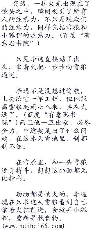 这个声音响起之后,镜头里就失去了李逸的声音,只有雪狼庞大的身影渐渐向小狐狸笼罩而去,在极光之下,有一种病态的美感。