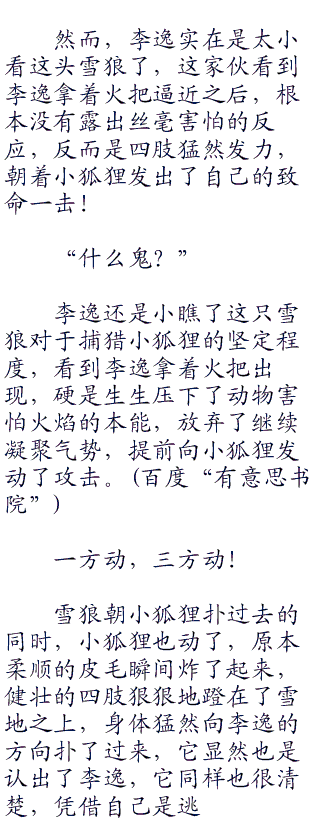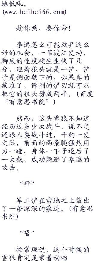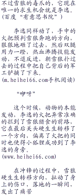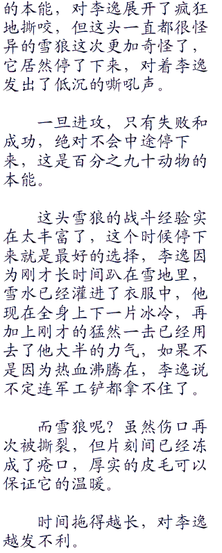 此刻,在李逸的眼前,一头遍体鳞伤,浑身打颤的雪狼,看似不堪一击,但你要真正这么想就错了,此刻的他或许才是一生当中状态最好的时刻,这个时候的雪狼会拼尽全力,用李逸锋利的牙齿和狼爪击毁一切妄图阻止他生存下去的障碍,这个时刻,哪怕是一直白熊站在它的面前,它都敢上去拼命,更别说李逸这么一个人了。