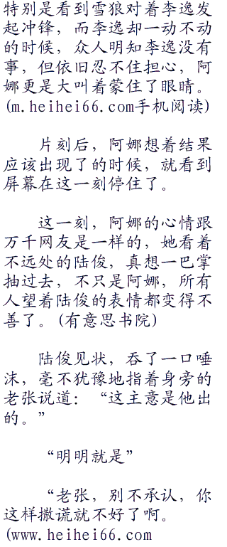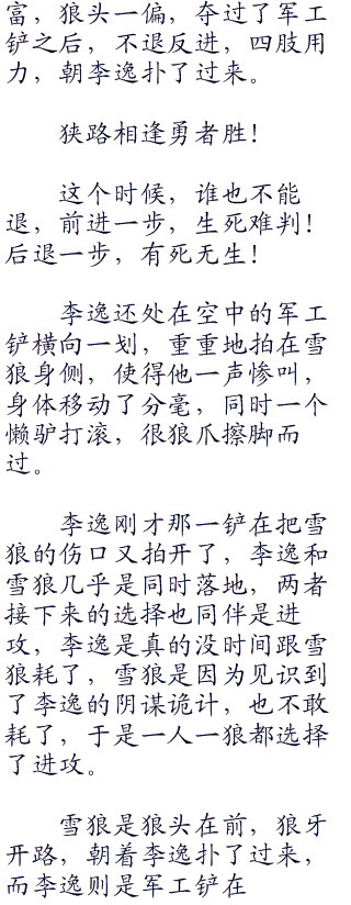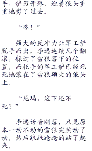 接下来的事情证明了李逸的猜想,这头该死的畜生根本就不跟李逸正面接触,只要看着李逸前进他就后退,看着李逸后退他就前进,始终跟李逸保持三米左右的距离,这个距离上李逸根本就无法对雪狼造成一击致命的威胁,而雪狼却片刻间就可以跑到李逸的身前,用它锋利的牙齿和狼爪把李逸撕成碎片。