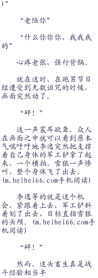 屏幕中,李逸坐了下来,双手枕着军工铲,解开了自己的外套,对着雪狼,气喘吁吁地说道:“你说你,好端端的跟比同伴打什么架,你不打架,就不会受伤,没有受伤就不会来捕猎,不捕猎就不会遇见我,不遇见我,我们也不用打架,我更加不会累得半死,唉”