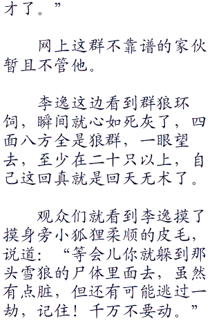 大家此时也知道李逸刚才的放弃是故意演出来的,但看他跟一只死去的雪狼说话,还是忍不住笑了出来。