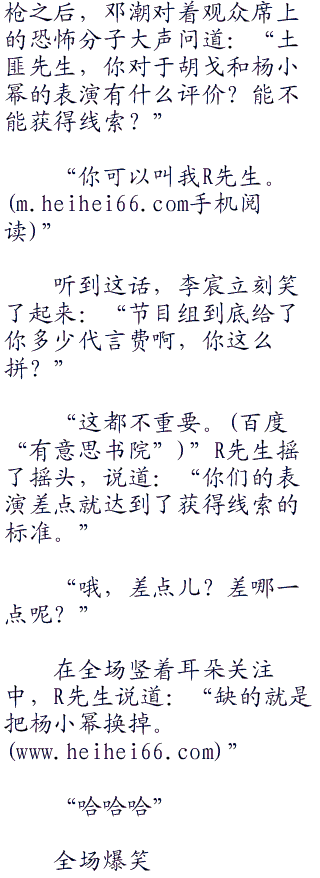 “对啊!”李宸趁着这个机会,赶紧对观众们说道:“来来来,有奖竞猜,猜对胡戈另一半的奖励李逸签名写真一本,记住!不是郑凯的,是李逸的!”