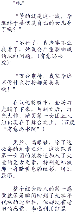 而兄弟团众人也没有时间去考虑这个线索了,因为他们今晚的第二次演出就要开始了,跑男第一女团出动。