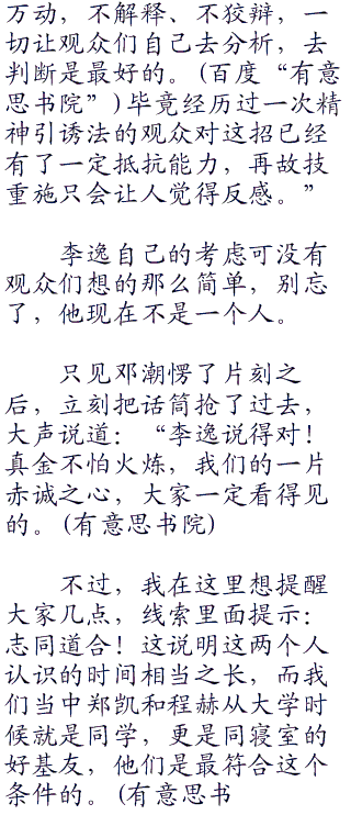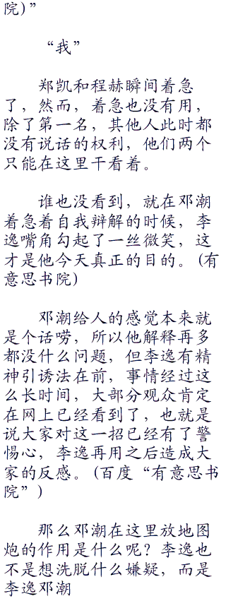 “什么叫指向我?”邓潮表示“宝宝相当不开心”,抢过话,说道:“我全程跑上跑下,尽心尽力的思考答案,我怎么看也不像是内奸啊,有我这么尽职尽责的内奸吗?”