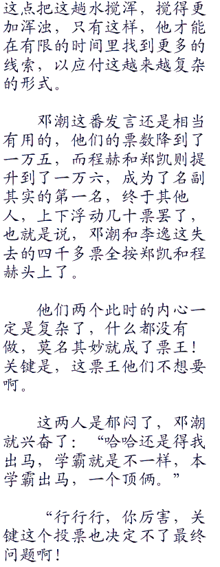 与此同时,投票通道开始了剧烈的变动,邓潮和李逸这对背叛cp一马当先,最终斩获了一万九千多张,追在他们后面的就是程赫跟郑凯的一万两千多张,至于李逸和baby以及邓潮和李宸都没有获得多少投票。