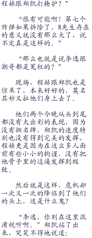 这时,r先生开口说话了:“你们猜错了我的合伙人,那么,炸弹的线索我肯定是不可能告诉你们的,但是我可以告诉你们一个很重要的线索。”