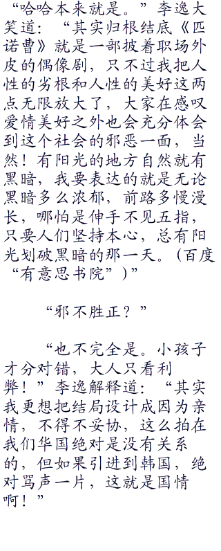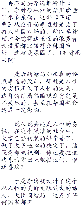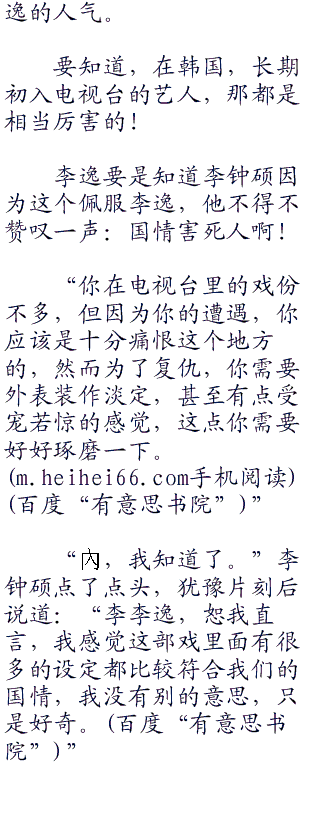 李逸这句话的意思就是:你代表的不只是里,还有sbs,甚至是整个韩国演艺圈,你表现好不好,我相信你自己比我更加在乎。
