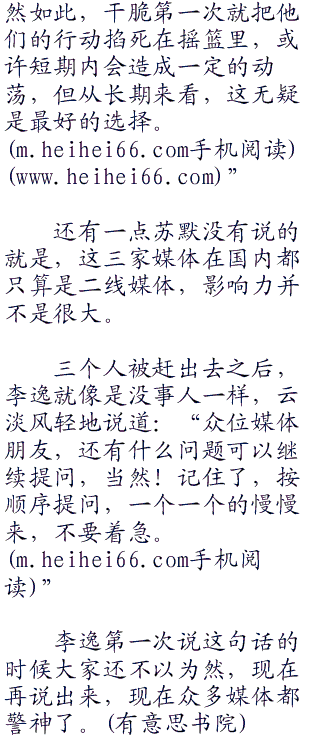 李逸理都没理这些跳梁小丑,而是平静地对一旁的杨灿说道:“杨经理,记住这三家媒体,以后只要是我的作品,不允许他们进行任何采访。”