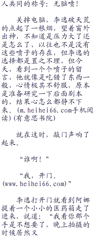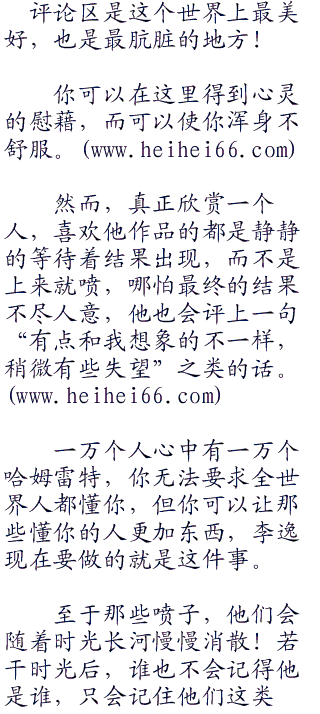 网上的评论五花八门,看到那些鼓励、期待的话李逸会非常高兴,看到那些建议性的话李逸会思索一下可行性,但对于那些上来就是喷得人,李逸真想给他把评论都删掉。