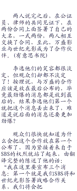 “接下来,让李总为我们宣布公司的第一个合作伙伴万盛影业。”