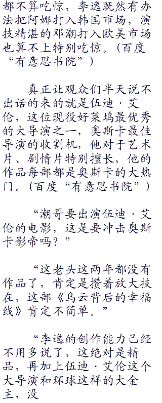 “观众朋友们好。”邓潮站了起来,正正紧紧地说道:“非常荣幸可以参与好莱坞的制作,更加难得的是可以和伍迪·艾伦这样的大导演合作,多的话不说,朋友们倒是就等着看我的表现好了。”