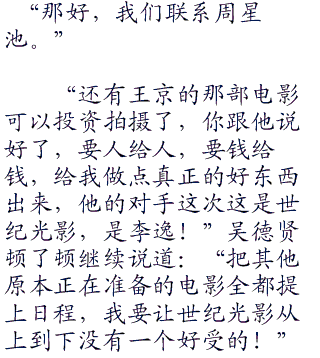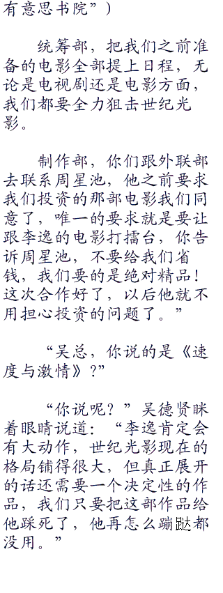 然而,更加疯狂的事情还没有结束,威尔·道森站了起来,操着怪模怪样的中文,认真地说道:“我将代表环球影业于世纪光影形成战略合作关系!”