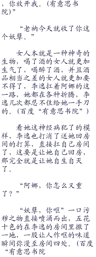 李逸去扶阿娜,结果阿娜还要推他,口里还嚷嚷着:“妖孽,我告诉你,我会七十二变!我我是齐天大圣,我我一个筋斗可以翻十万八千里,我警告你,你你放开我。”