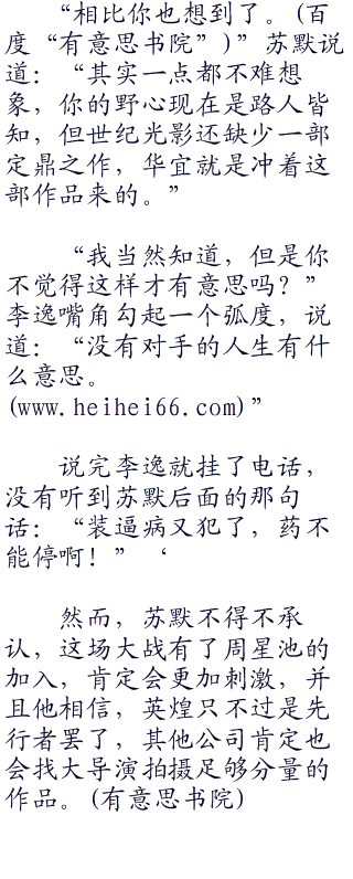 对付李逸最好的办法还是从内部着手,无论是彩蝶跟kbs合作,还是华宜跟康斯坦丁合作,都不是什么大不了的事情,他们的全部精力也不可能是国内,真正正确的还是用华国人自己的作品去挑战李逸,而整个华国,具备挑战李逸的人当中,肯定是有周星池一个的,并且还是绝对强敌!那一声声“星爷”可不是白叫得。