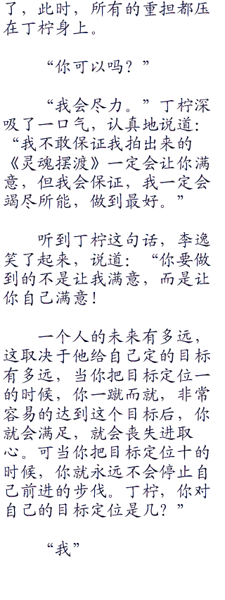 丁柠的激动李逸是可以理解的,这个饱经磨难的女孩终于要向自己的梦想跨出最坚实的一步了。