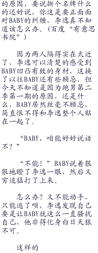 李逸被baby这一嗓子吓到了,于是向她投去了无辜的眼神:“我又怎么着了?”