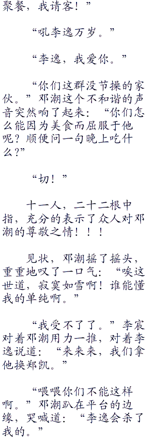 从一个欢乐的气愤带到现在这种恐怖的气愤,李逸其实只用了三句话、两个微笑再加一个笑声,这还不算什么,看看阿娜他们的表情,看看baby那声发自肺腑的“不要”,他们都被带入了李逸设计的语境当中。