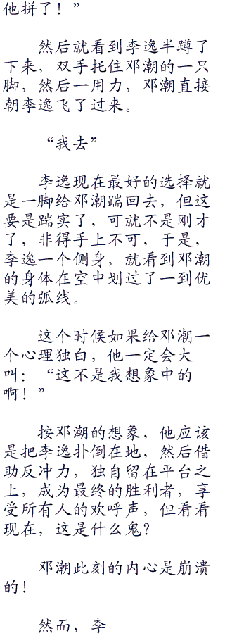 悲剧的邓潮暂且不提,其他的人都战斗到了一起,张军这个主力依旧是硬扛着李宸和王阻蓝,这是他们之前说好了的,张军要想一拖二的话就抓住最强的李宸,顺便捞一个王阻蓝。